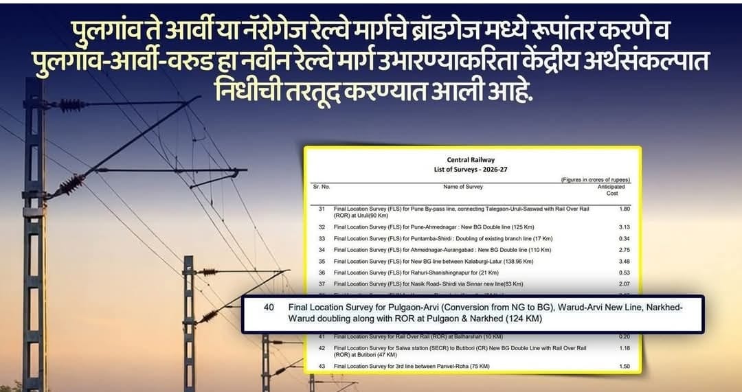 दरम्यान, केंद्र सरकारने ही मागणी मान्य केल्याची माहिती समोर येताच कार्यकर्त्यांनी समाधान व्यक्त केले. पुलगाव-आर्वी रेल्वेमार्ग ब्रॉडगेजमध्ये रूपांतरित झाल्यास प्रवासी व मालवाहतूक दोन्ही दृष्टीने मोठा दिलासा मिळणार आहे. यामुळे आर्वी तालुक्याच्या विकासाला गती मिळण्याची अपेक्षा व्यक्त केली जात आहे.