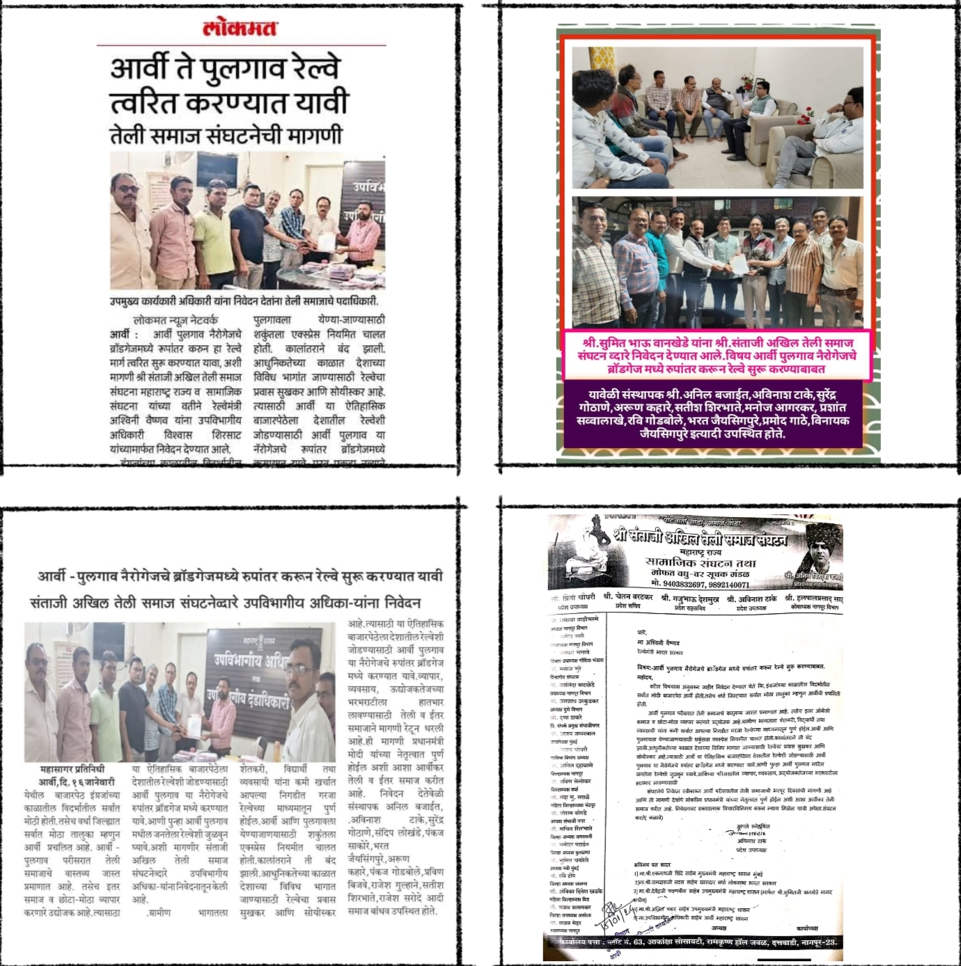 संघटनेच्या वतीने दि. १५ जानेवारी २०२४ रोजी प्रदेश उपाध्यक्ष अविनाश टाके तथा प्रविण सेलोकर यांच्या नेतृत्वात रेल्वे ब्रॉडगेजसाठी निवेदन सादर करण्यात आले होते. हे निवेदन उपविभागीय अधिकाऱ्यांमार्फत केंद्रीय रेल्वेमंत्री अश्विनी वैष्णव यांच्यापर्यंत पोहोचविण्यात आले होते. संघटनेने सातत्याने या मागणीचा पाठपुरावा करत प्रशासनाचे लक्ष वेधले.